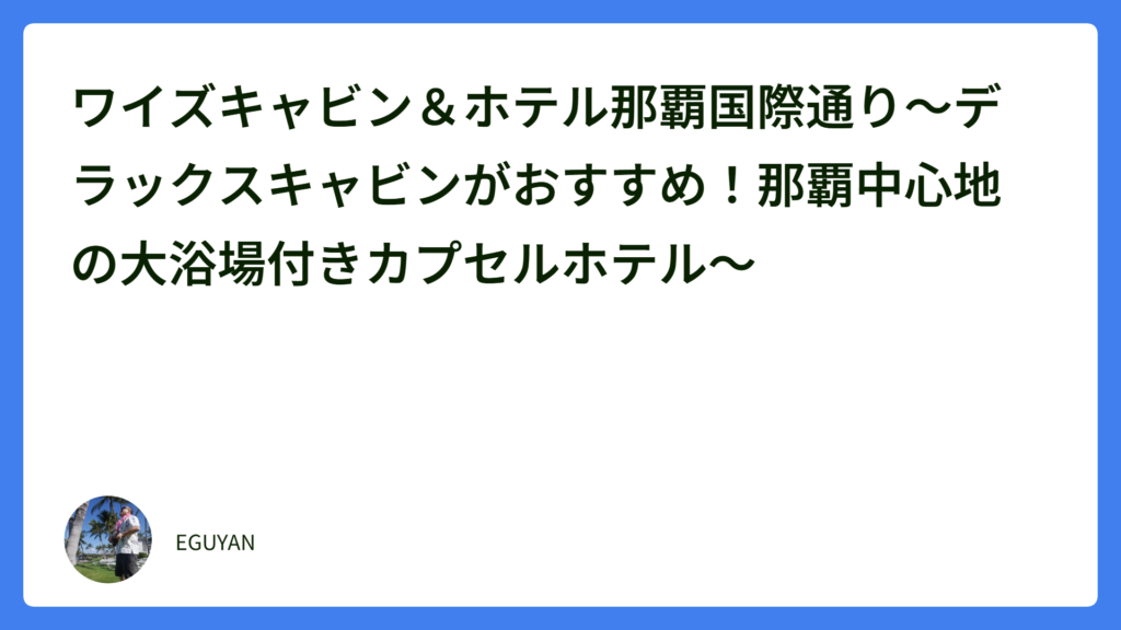 先月沖縄出張に行きましたが、2泊は浜比嘉島の民宿「ゆがふの郷」でしたが、最後1泊は「ワイズキャビン&ホテル那覇国際通り」に泊まりました。 その名の通り、那覇の中心地・国際通りのすぐ近くにあります。 モノレールの県庁前駅か … 続きを読む ワイズキャビン&ホテル那覇国際通り~デラックスキャビンがおすすめ!那覇中心地の大浴場付きカプセルホテル~