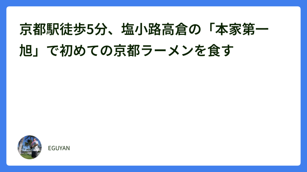 3~4年ぶりくらいに京都に行ってきた。 昼食でいただいた京都ラーメンの名店「第一旭」をご紹介。 京都ラーメンの存在は知っていたけど、今回初めて食べてクセになりそうな味だった! [s_ad] 目次 5泊6日の長期出張旅京都 … 続きを読む 京都駅徒歩5分、塩小路高倉の「本家第一旭」で初めての京都ラーメンを食す