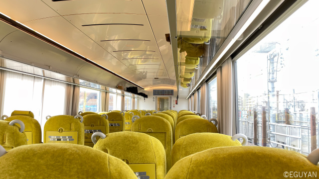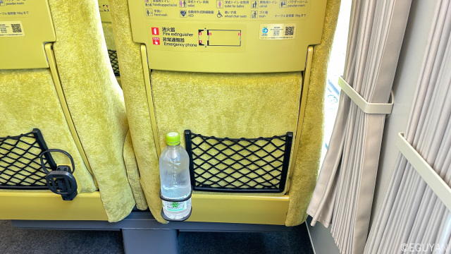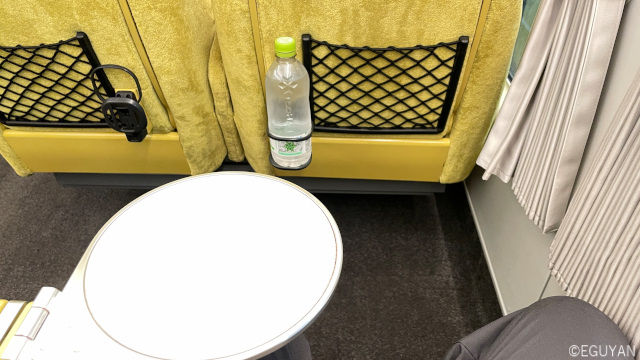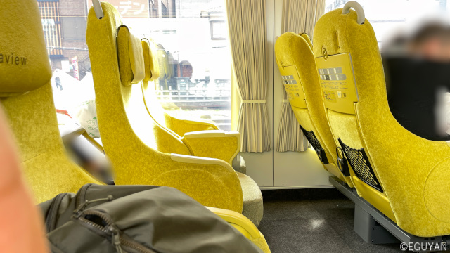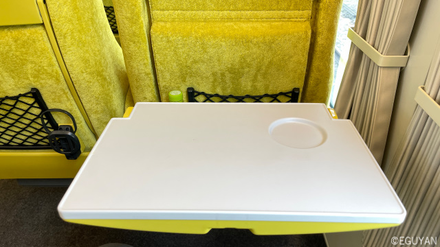 ラビューの座席はリクライニングシートで、足元も広々。テーブルは大小2つあり、各席に電源コンセント付き。ドリンクホルダーまであります。JRでいえばグリーン車レベルと言っていいくらい快適です。